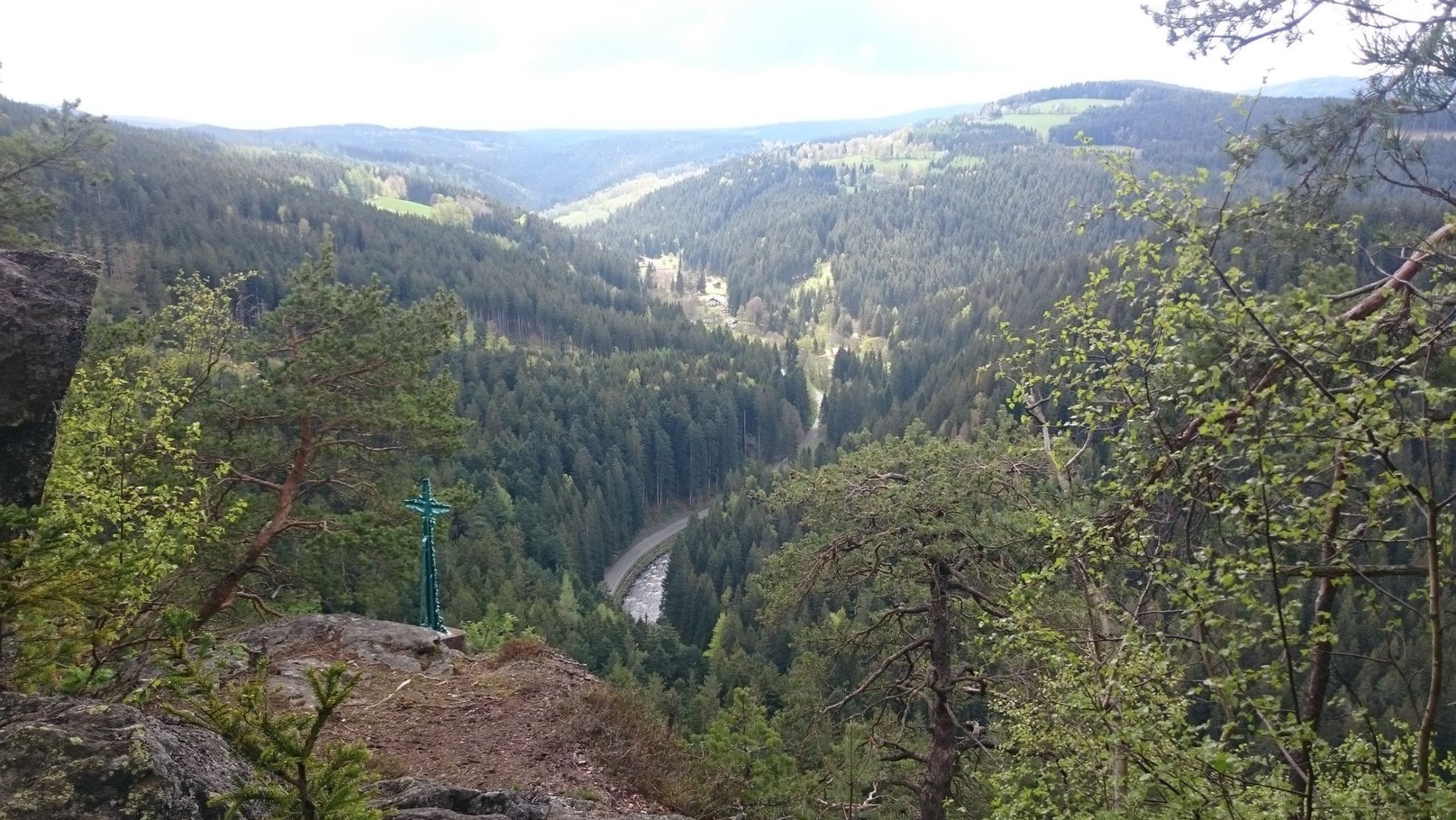 📍 Na horním okraji skalního hřbetu stojí pamětní kříž.