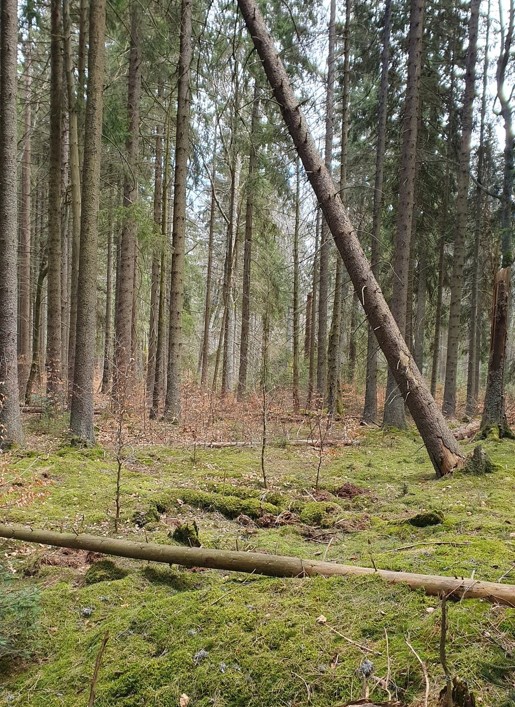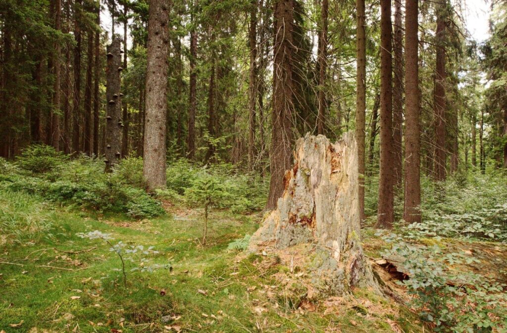 Až dvě třetiny území tvoří: padlé kmeny, trouchnivějící pařezy, vývraty.