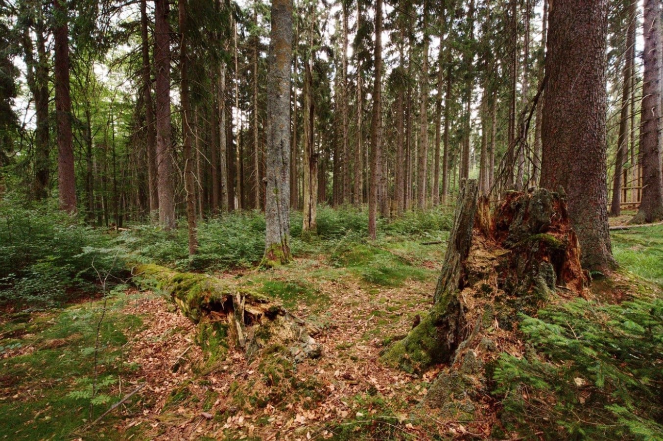 Až dvě třetiny území tvoří: padlé kmeny, trouchnivějící pařezy, vývraty.
