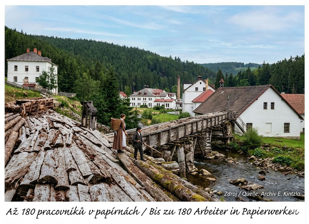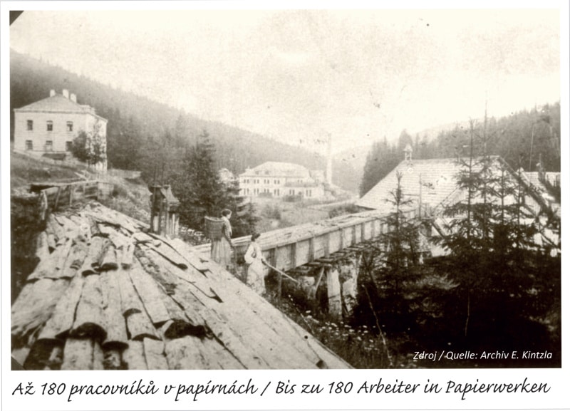 Když vyhasly sklářské pece, využil energii řeky Vltavy židovský podnikatel Jakub Wien. Přestavěl areál na papírnu a brusírnu dřeva.