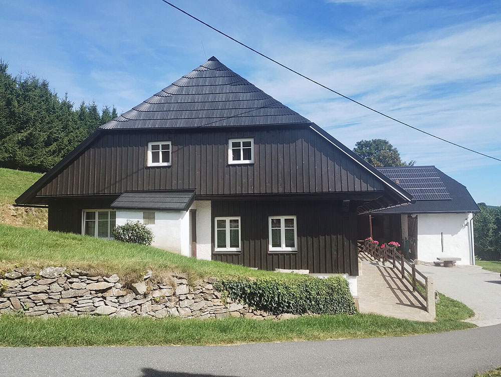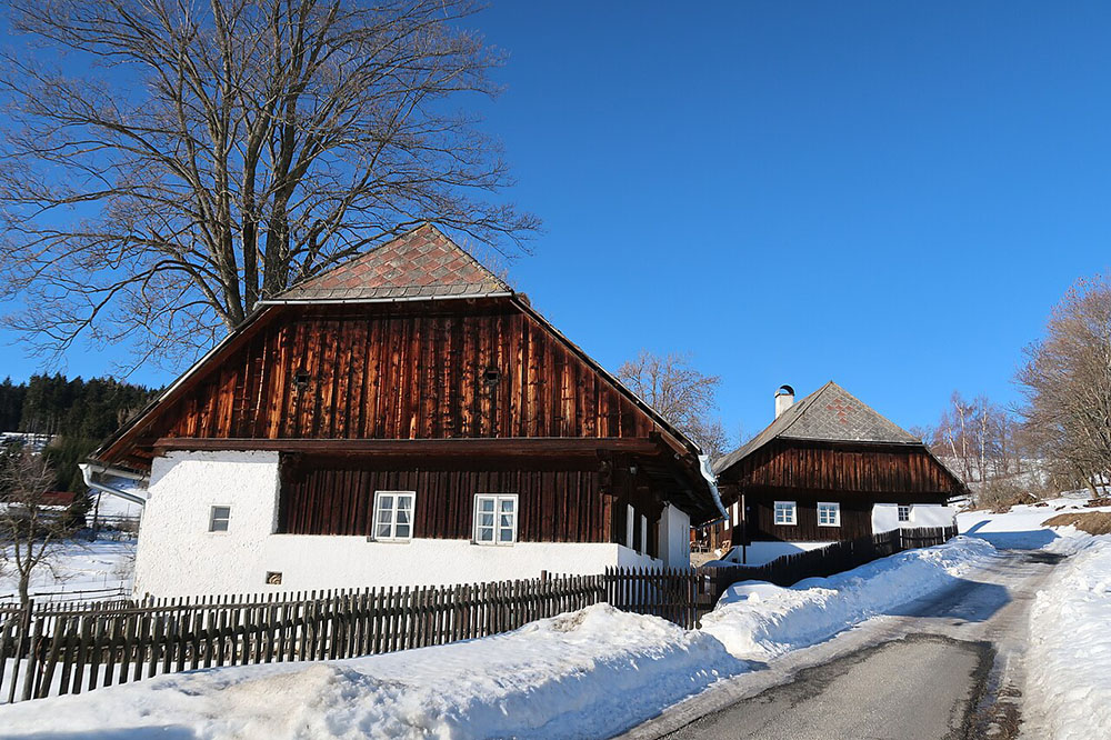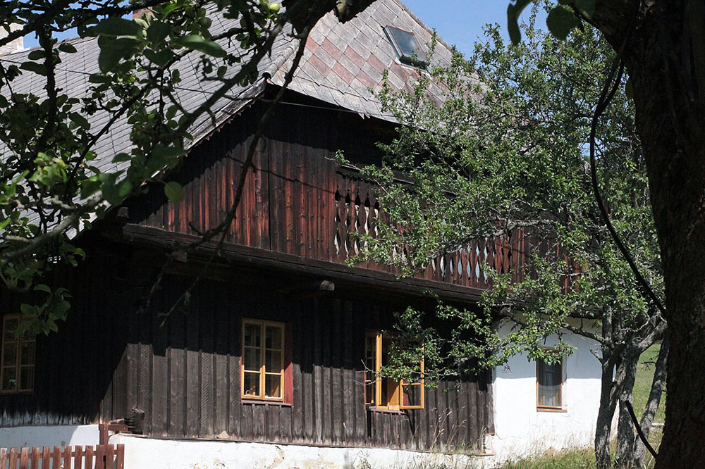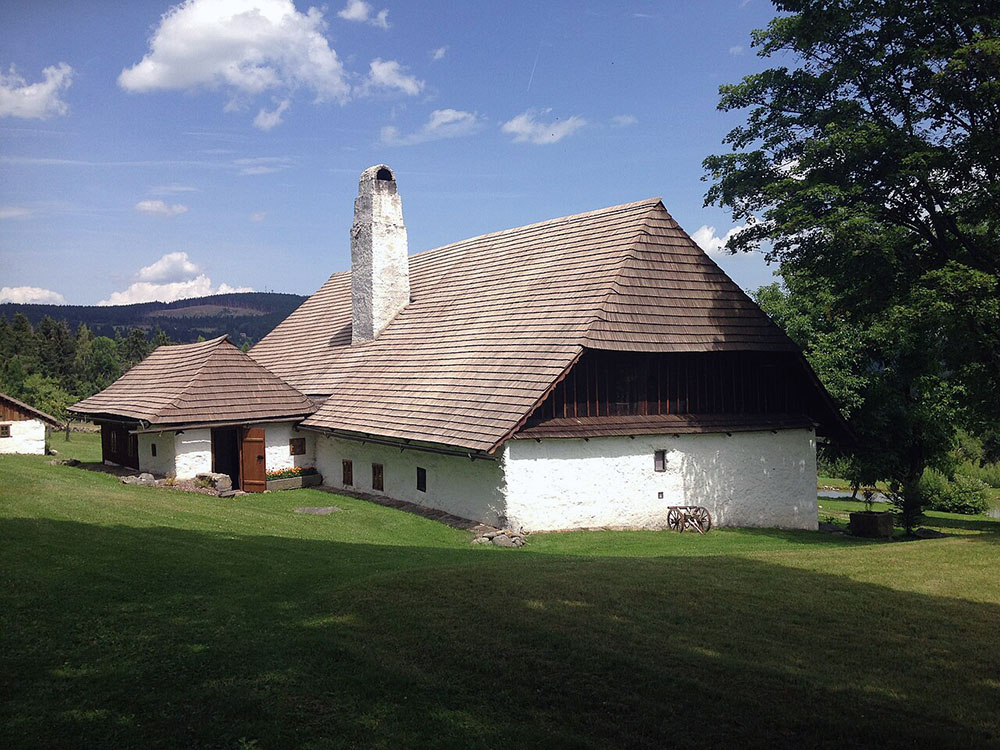 - původní šumavské usedlosti s bílými štíty a šindelovou střechou
