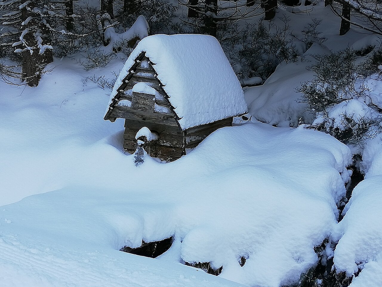 V nízkém lesíku, jen pár metrů za Vlasatou cestou, vyvěrá čistý horský potůček, z něhož je pitná voda svedena černou hadicí do dřevěného přístřešku s lavicí.